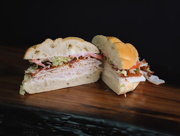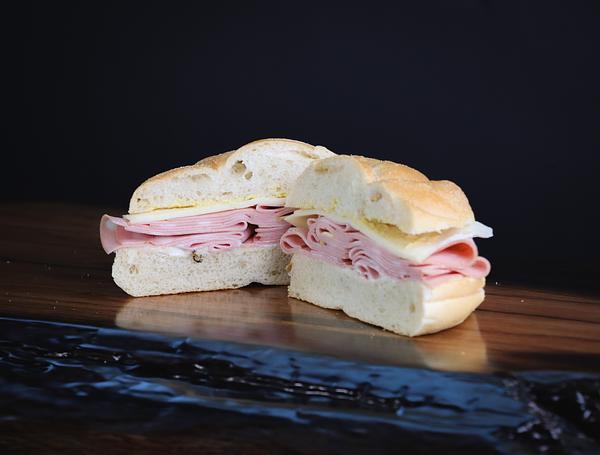 Ham, American cheese, turkey, lettuce, tomato, pickles, and mayo.