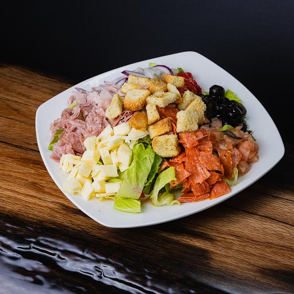 Romaine lettuce, picante provolone, genoa salami, peperoni, ham, roasted red peppers, red onion, tomato, black olives, and croutons.